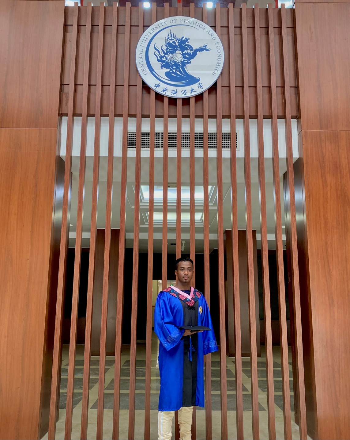 毕业季来临,可是拿到中财大的录取通知书时的场景还历历在目,转眼间就度过了两年的学习时光。在这两年里,我学到了很多知识,也结识到了许多来自不同国家的同学,并且更加确定了我对国际商务这一专业的热爱。非常感谢我的指导老师张晓涛经理、班主任闫倩楠老师,以及所有专业课和选修课的老师们对我的悉心指导。谢谢崔秀斌和鲁斯兰同学在学习上与我结伴,能认识你们真的非常开心,学习小组永不解散哈哈!最后,借用那些新冠疫情高分作文中的一句话,“后来,他朝我笑,不止是眼睛”。希望在不久的将来,我们可以回到母校与大家线下团聚。最后,祝愿母校和母院蒸蒸日上,也祝各位同学在接下来的学业及事业上发展顺利!