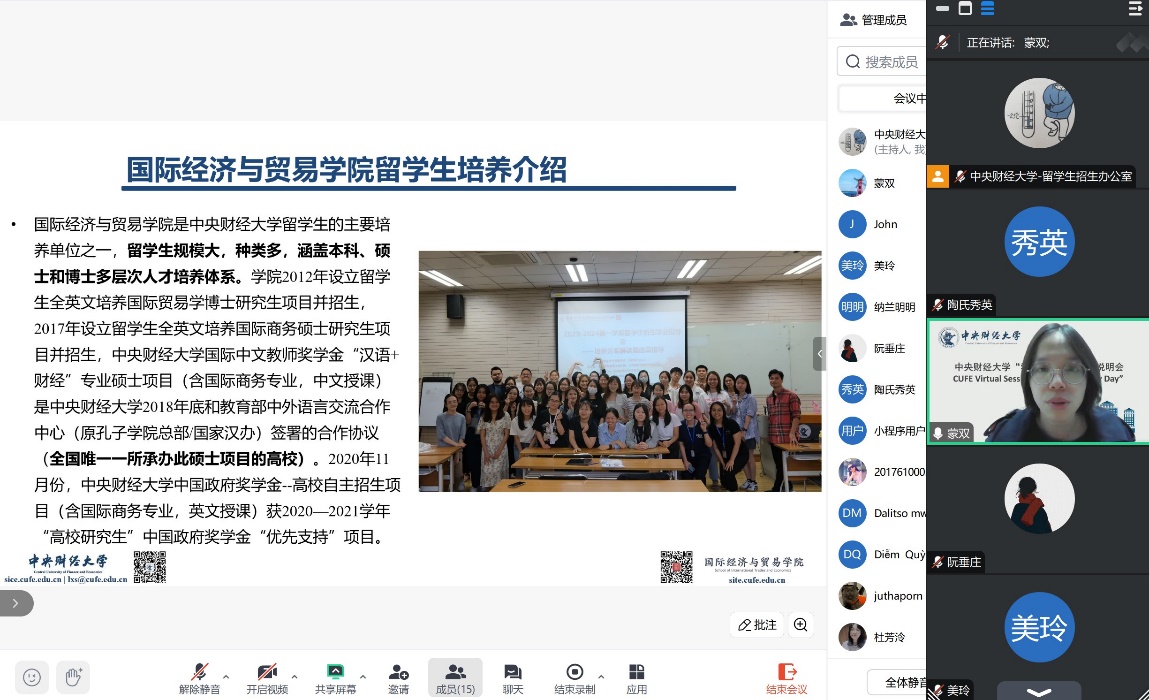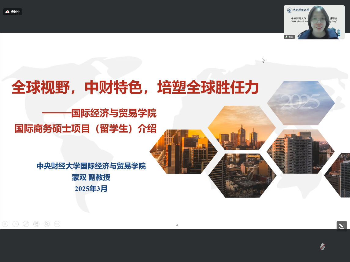 2025年3月7日,“留学中财大”公司日-M88官方网站线上招生宣传说明会在腾讯会议举行。公司蒙双副教授为有意申请公司的国际员工介绍了公司基本情况、公司职工培养成效、国际商务专业学习内容以及职工“汉语+国际商务”项目情况。