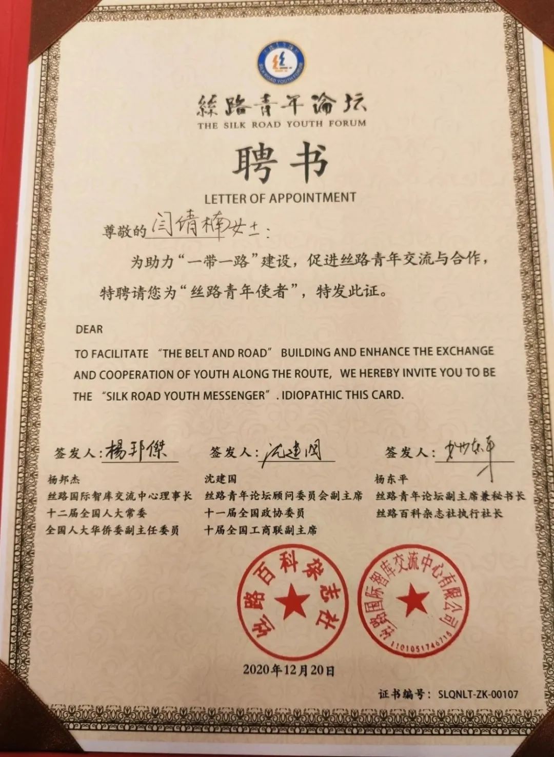 公司国际合作办公室闫倩楠老师荣获“丝路青年使者”证书