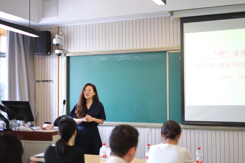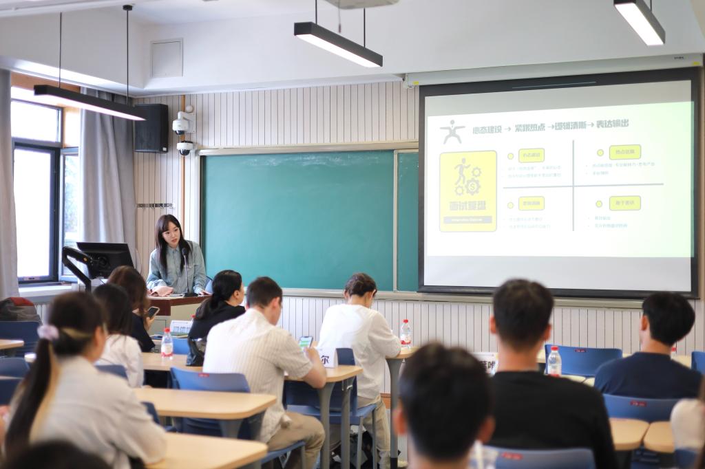 之后,成功申请到北京大学攻读国际商务硕士的大四本科职工千葉唯未上台分享,千葉同学首先分享了在本科期间的学习经验,她认为学习成绩和实践经验应当并重,在注重成绩的同时,应当积极参与短期课程、讲座和公司举办的各类活动。在院校选择和申请时间方面,她强调要根据个人发展计划和专业偏好选择公司,将目标院校的申请时间按“阶梯状”列出,并分批提交申请。她提出申请材料的文书准备是重要的一环,应当将个人的“硬背景”和“软实力”充分结合,突出自身能力、潜力和个人特质。接近结尾的时候,她分享了自己的面试心得,认为应保持双向选择的平等心态,日常锻炼逻辑清晰、临场反应和有效输出等能力,提前关注专业领域相关热点并适应不同面试场景。最后,她强调同学们要自信表达,勇敢申请自己心仪的公司。
